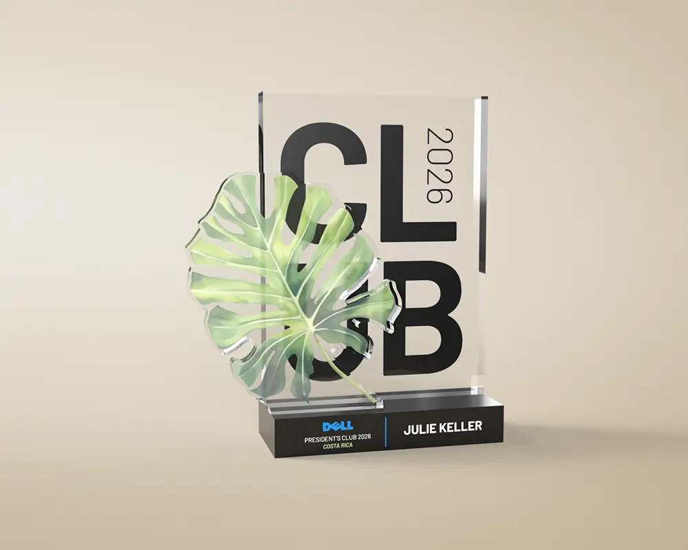 The Canopy is a sleek acrylic piece showcasing a bold cut-out design of a monstera leaf, elegantly mounted to the front to capture a vibrant, modern sense of achievement.